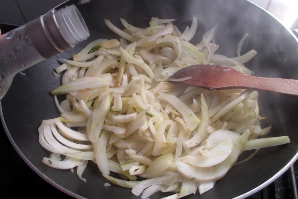 Corta cebolla y hinojo en rodajas finas y ponlas a sofreír en la cacerola con 2 cucharaditas de aceite, un poco de sal y un poco de tomillo seco.