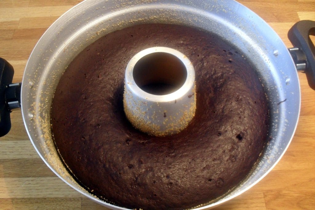 Hornea a 180ºC durante unos 25 minutos o hasta que la rosca de chocolate esté bien levada y dorada en la superficie. Haz la prueba del palillo para asegurarte de que la rosca esté bien cocida por dentro. Retira del horno y deja enfriar dejando el molde en el horno apagado y abierto.