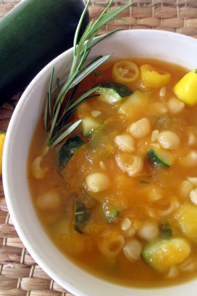 • ¡Tan pronto como la pasta esté cocida, nuestra sopa de calabaza y calabacines está lista! Aquí está servida en el plato con romero y guindilla como decoración: ¿no es preciosa?