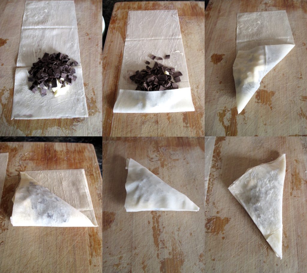 Para cada rectángulo, coloca en un extremo la porción de plátanos y chocolate negro preparada anteriormente. Y luego, como en la foto, dobla formando un triángulo. Al terminar, pincela nuevamente con un poco de la mezcla de aceite y agua. Repite esta operación y forma todos los triangulitos.