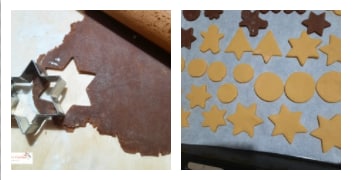Pasado el tiempo, saca la masa quebrada del frigorífico, espolvorea una superficie con harina y extiende la masa, primero la de vainilla y luego la de cacao, hasta un grosor de aproximadamente medio cm. Luego corta tus galletas con los cortadores navideños y colócalas en una bandeja forrada con papel de horno. Con la masa restante, forma nuevamente un bloque y extiende, sigue formando galletas hasta acabar los ingredientes.