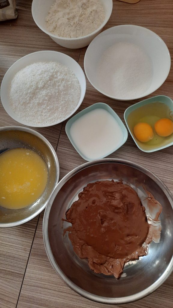 Para preparar esta deliciosa tarta de coco y chocolate, comienza rompiendo dos huevos en un bol. Añade el azúcar y bate con una varilla manual o eléctrica. Añade ahora la mantequilla derretida y la leche, y mezcla bien todo. En este punto, añade una parte de la harina 00 y mezcla para incorporarla a los líquidos. Añade el resto de la harina y mezcla hasta que se absorba. Haz lo mismo con la levadura y el coco rallado. Derrite el chocolate al baño maría y añádelo a la mezcla. Mezcla todo con una espátula o una cuchara.