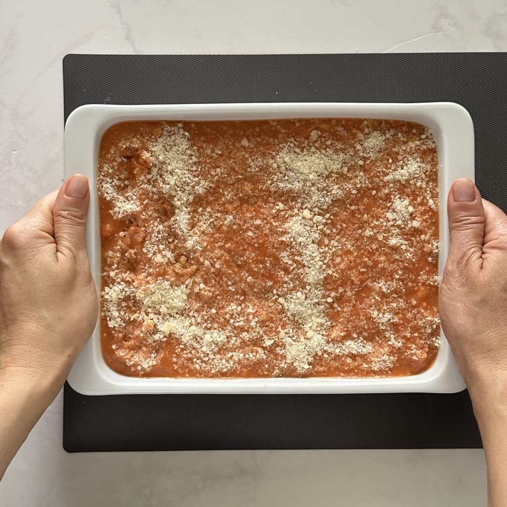Una vez que hayáis rellenado todos los canelones y los hayáis colocado en la bandeja,