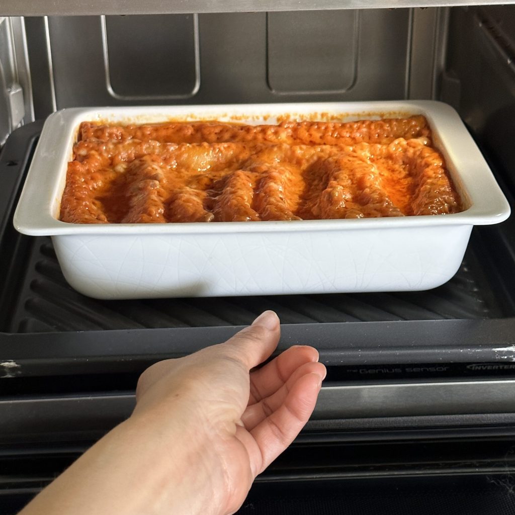 Ahora, podéis proceder con el segundo paso de cocción, donde usaréis solo la función grill para gratinar los canelones en el microondas.