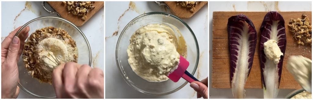 Poned las hojas de achicoria en una tabla de cortar y rellenadlas con una cucharada abundante de relleno de ricotta.