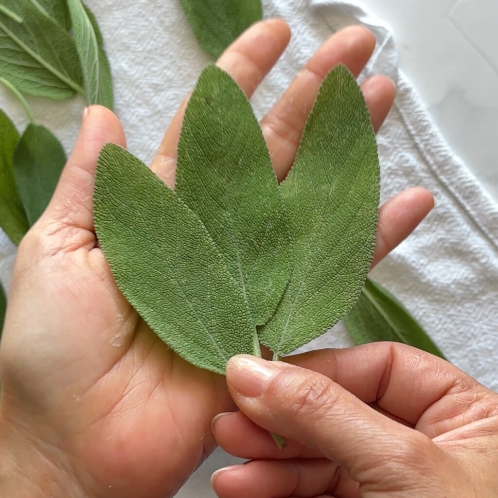 Laven las hojas de salvia, escúrranlas y colóquenlas sobre el paño de cocina.