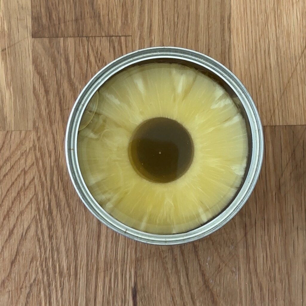 Abre la lata de piña, vierter 50 ml de jugo en un cazo y el resto ponlo en el plato hondo.