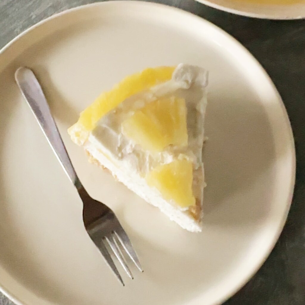 Decora la superficie con las rodajas de piña sobrantes, puedes cortarlas también en pequeños trozos y distribuirlas por toda la superficie. Cubre el molde con un plato o una hoja de aluminio y coloca la tarta a enfriar y endurecer en el frigorífico, durante 3-4 horas.