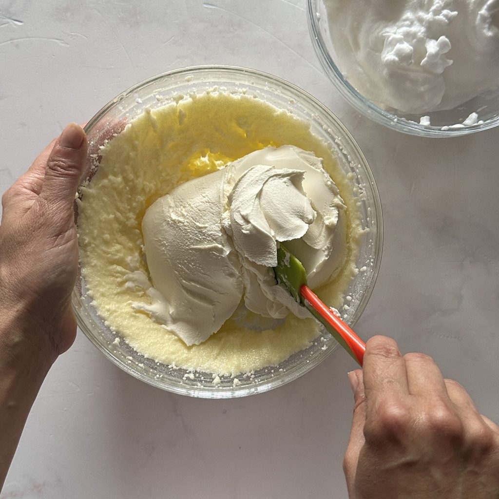 añade la otra mitad de las claras e incorpóralas completamente hasta obtener una crema de mascarpone bien montada.