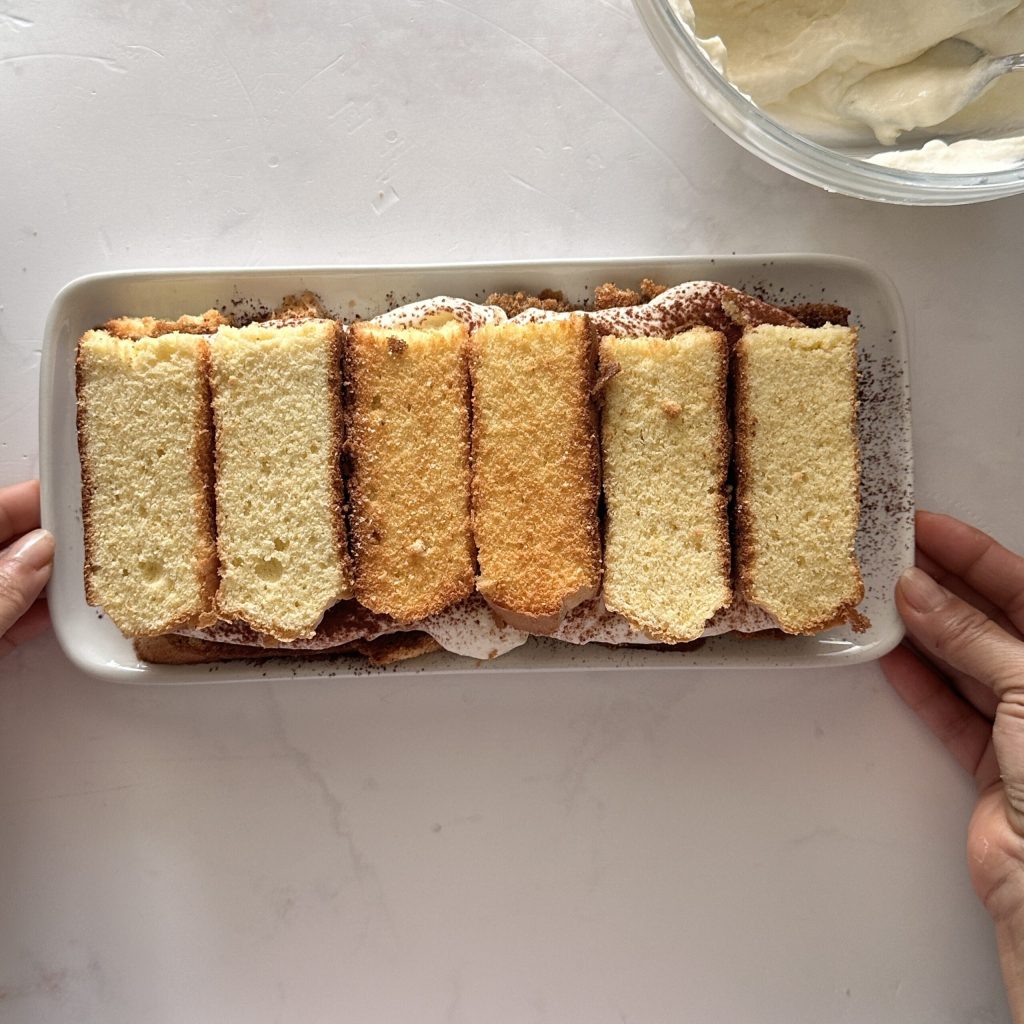 Coloca encima los otros bizcochos, acomodándolos bien sobre la crema de mascarpone.