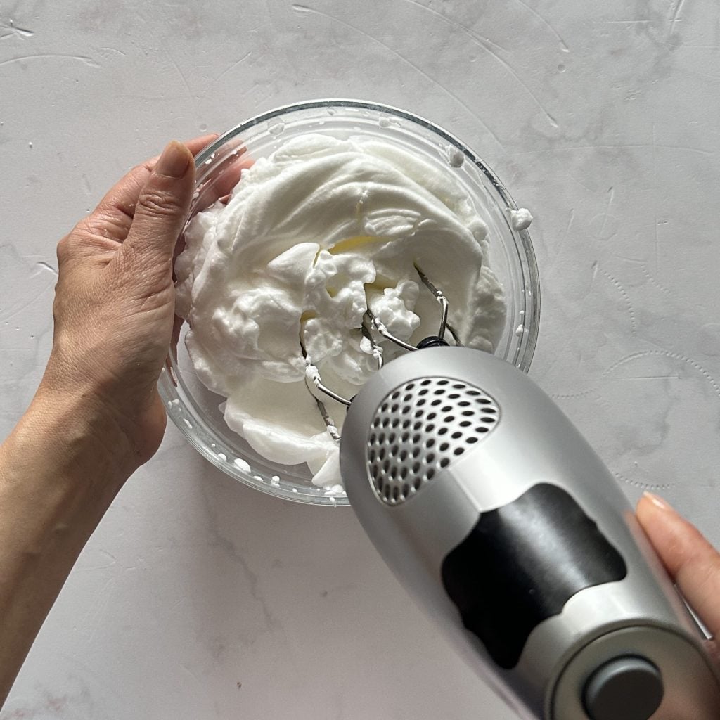 Con la ayuda de la batidora eléctrica, monta las claras,