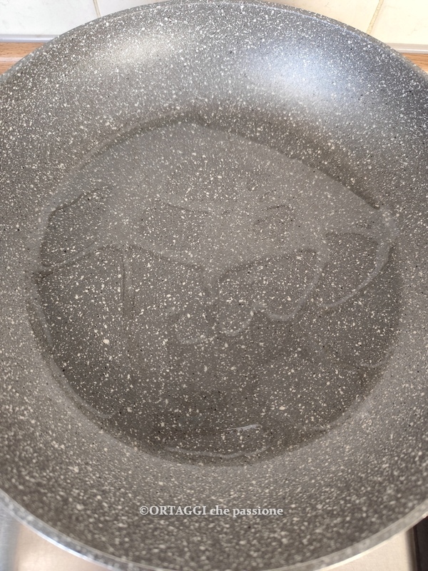 2. En una sartén grande y antiadherente (o en la plancha) verter un hilo de aceite, luego calentar ligeramente.