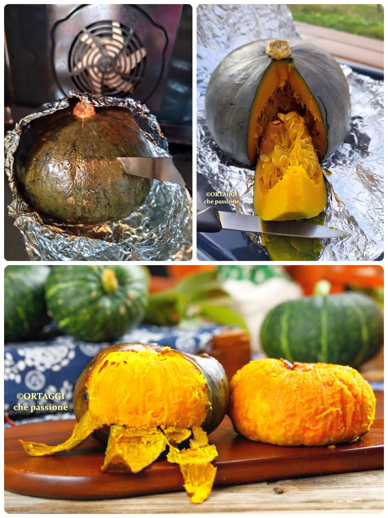 Cocinar en horno estático caliente a 200°C (o en horno ventilado a 180°C) hasta que esté bien tierna, se necesitan al menos 20 minutos. Una vez cocida, la cáscara se quita prácticamente sola.Lavar externamente la calabaza, luego colocarla sobre papel de horno o de aluminio, entera o en rodajas grandes (en este último caso conviene quitar ya las semillas).