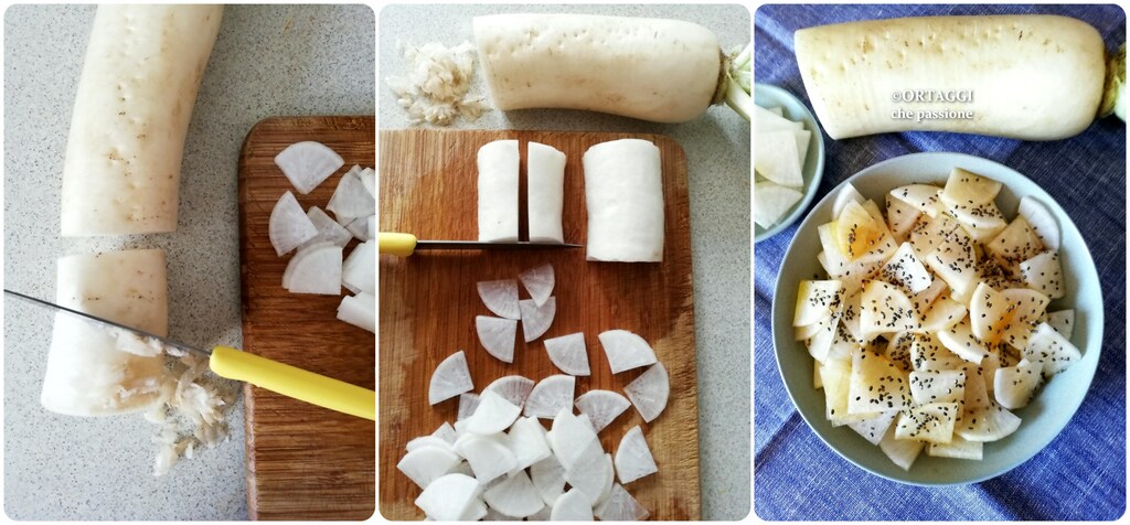 El daikon crudo en ensalada es una receta fácil para disfrutar de esta verdura poco conocida y utilizada en Italia. El daikon crudo tiene un sabor fresco y crujiente, su dulzura delicada se fusiona con una nota ligeramente picante.