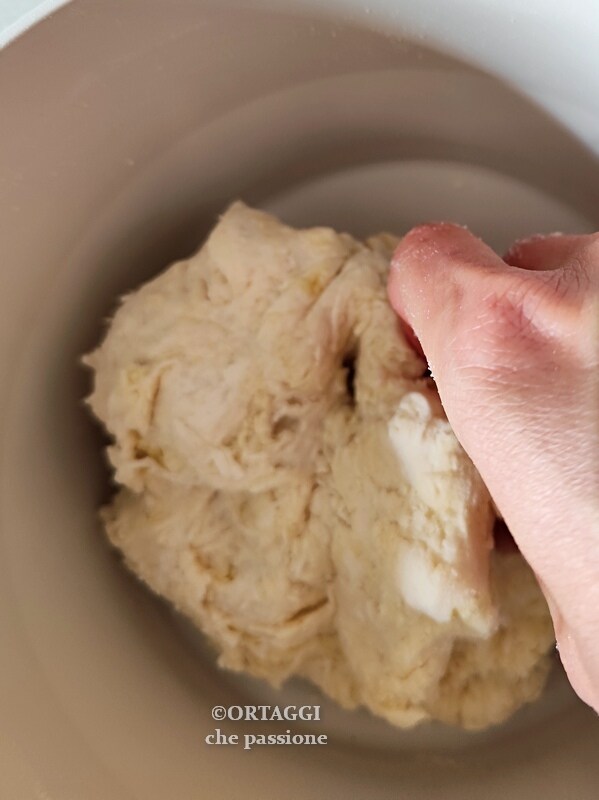 Mezclar con un tenedor y, si es necesario, para obtener una masa elástica, añadir más agua o harina.