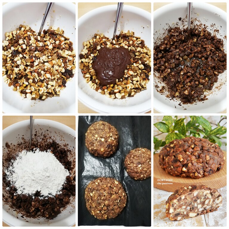 En un bol grande, verter todos los ingredientes preparados como se indica anteriormente, primero los sólidos y luego los fundidos (chocolate y miel), después mezclar todo con una cuchara de palo o mejor con las manos.