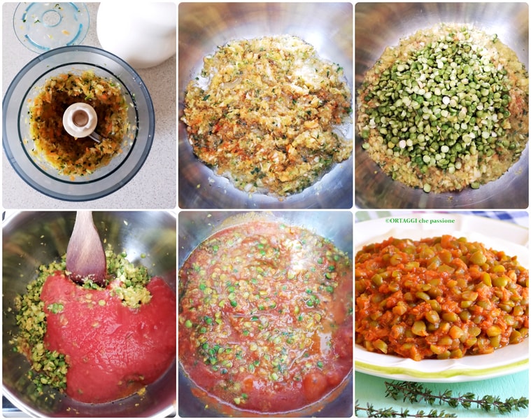 Rehogar las verduras con poca agua y aceite durante unos minutos. Luego agregar los partidos (o los guisantes frescos o congelados), dejar que tomen sabor, añadir vino (opcional). Añadir el puré de tomate y cubrir.