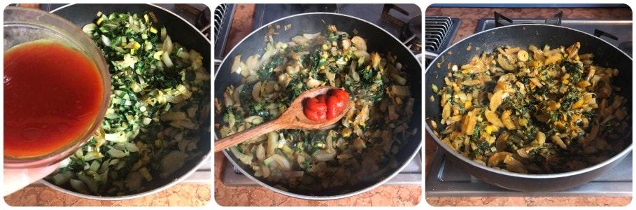 Verter esta mezcla en la cazuela, añadir una cucharada de concentrado de tomate y continuar la cocción durante unos diez minutos, mezclando de vez en cuando. Si las verduras se secan demasiado, añadir algunas cucharadas más de agua caliente.