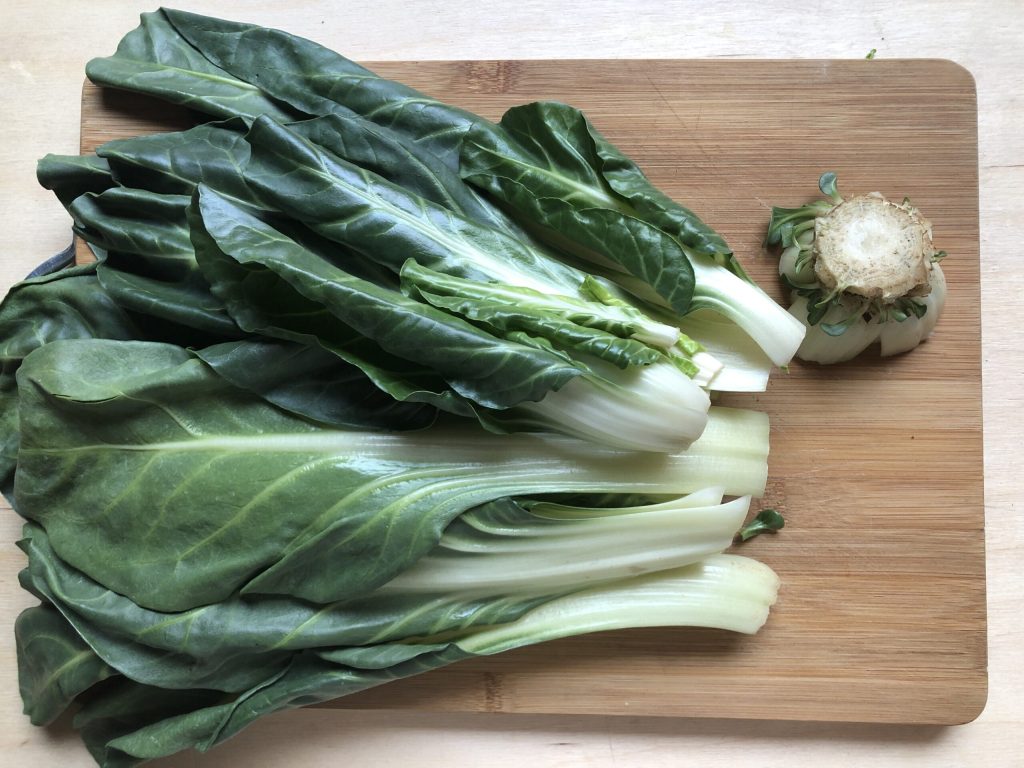 Cortar la parte final del manojo de acelgas, separar las hojas y lavarlas muy bien bajo agua corriente.