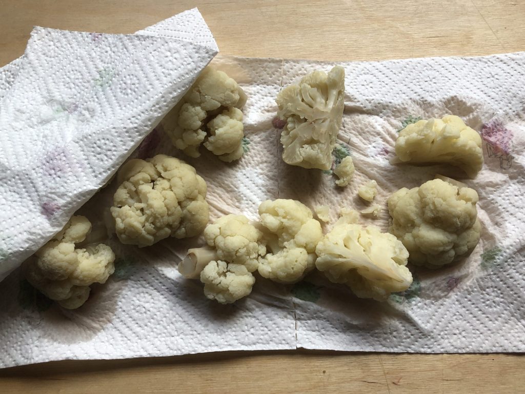 A continuación, pásalos por el pasapurés con delicadeza para eliminar el exceso de agua. Recoge el líquido que sueltan, pásalo por un colador para recuperar posibles restos de coliflor y vuelve a aplastar: deberás obtener una textura tierna pero no un puré. Para que te hagas una idea: mi coliflor bien escurrido pesó 313 g.