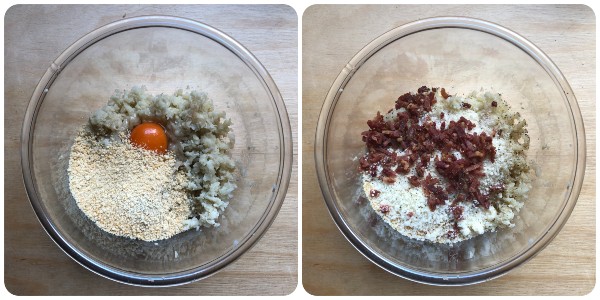 Añade al coliflor una buena pizca de sal, el huevo, el pan rallado, el queso rallado, el speck en trocitos y una molida de pimienta negra.