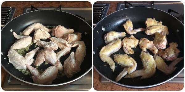• Dejarlo freír por unos instantes luego añadir las alas de pollo y dorarlas a fuego medio-bajo durante 5 minutos girándolas de vez en cuando con unas pinzas.