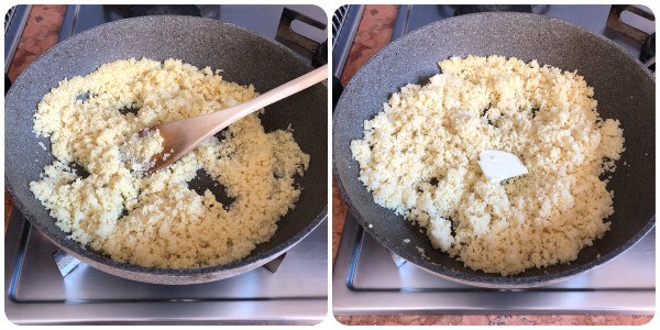 Rehidratar el cuscús siguiendo las indicaciones del paquete. Yo puse 150 ml de agua en una cazuela, la salé, añadí una cucharada de aceite y la llevé a ebullición. Luego vertí el cuscús y apagué el fuego. Lo dejé absorber el agua durante aproximadamente tres minutos, desgranándolo con una cuchara de madera. Luego añadí una nuez de mantequilla, volví a encender el fuego y continué la cocción a fuego muy bajo durante otros tres minutos aproximadamente, removiendo de vez en cuando.