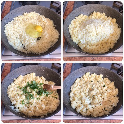 Luego apagar el fuego y añadir un huevo, 50 g de queso rallado, el provolone picado, las hojas de albahaca troceadas a mano, una pizca de sal y una molida de pimienta negra. Mezclar para amalgamar los ingredientes.