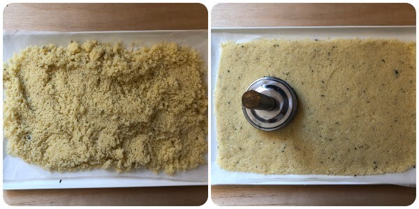 Verter la mezcla obtenida sobre una bandeja forrada con papel de horno y aplanarla primero con el dorso de una cuchara de madera y luego con un mazo de cocina hasta obtener un bloque plano y compacto de aproximadamente medio cm de grosor. Guardarlo en el frigorífico durante al menos una hora.