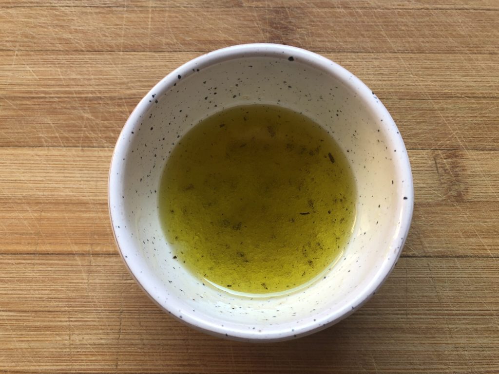 En un cuenco, mezcla dos cucharadas de aceite con una cucharada de agua y media cucharadita de salmuera boloñesa. La encontráis en el supermercado o podéis prepararla con mi receta: es facilísima de hacer y riquísima.