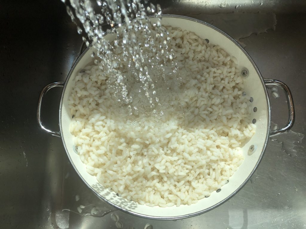 Cocer el arroz en abundante agua hirviendo con sal, escurrirlo al dente (por favor, nada de arroz pastoso) y luego pasarlo inmediatamente bajo agua fría corriente para detener la cocción y enfriarlo.