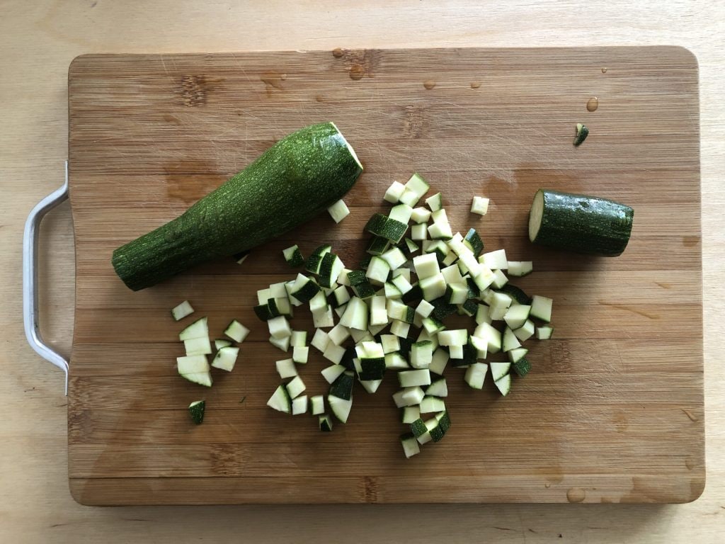 • Cortar los extremos de los calabacines, lavarlos y cortarlos primero en trozos, luego en rodajas y finalmente en dados.