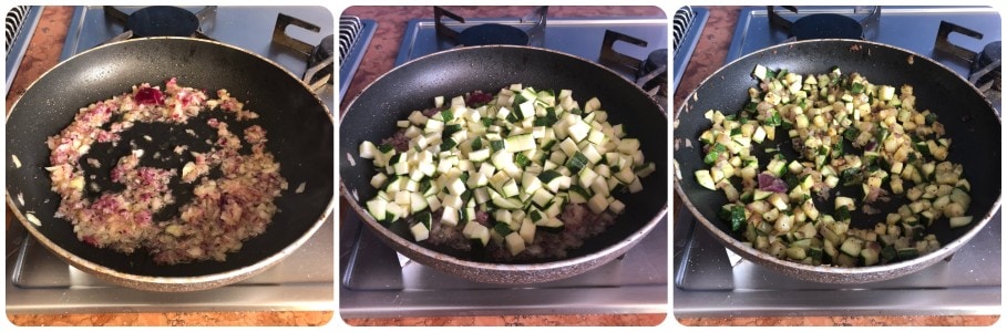 • En una sartén de tamaño mediano, calentar una cucharada de aceite y sofreír la cebolla finamente picada. Dejarla chisporrotear durante un instante, luego añadir los calabacines y dorarlos a fuego medio durante 6/7 minutos, removiéndolos a menudo. Cuando estén cocidos, salar y pimentar al gusto.