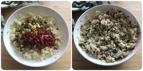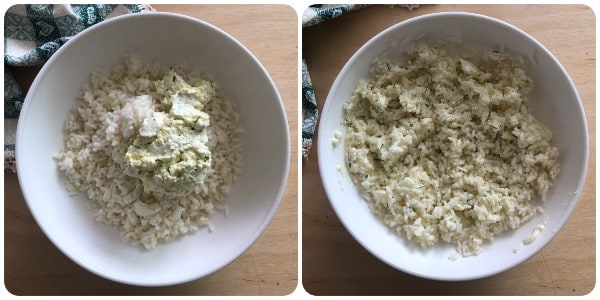 • Agregar esta crema de queso al bol del arroz y mezclar hasta que esté perfectamente incorporada.
