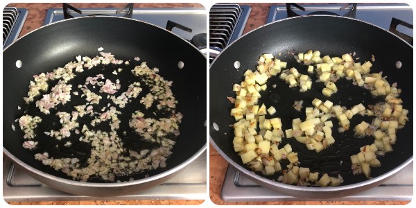 En una cazuela, calentar algunas cucharadas de aceite antes de añadir la chalota. Dejarla chisporrotear por un instante, luego añadir los dados de patata y saltearlos a fuego alto durante 5 minutos, removiendo muy a menudo.