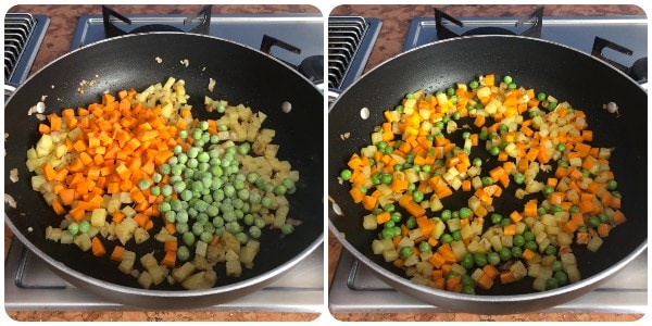 Luego, añadir las zanahorias y los guisantes aún congelados y cocinar durante 4 minutos.