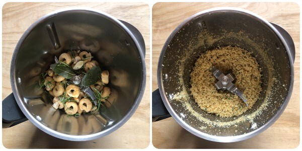 Colocar en una picadora los taralli, dos hojas de salvia, las agujas de una ramita de romero, medio diente de ajo pelado, una pizca de sal, una molienda de pimienta negra, 20 ml de aceite y 10 ml de vino blanco y picar hasta obtener una mezcla de migas gruesas. Con la Thermomix, yo he picado durante 7 segundos a velocidad 5.