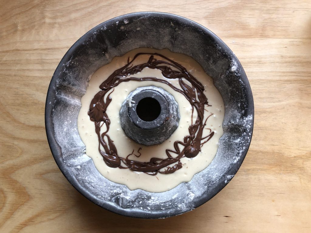 • Distribuir en esta masa un par de cucharadas de crema de avellanas. Yo la he suavizado ligeramente en el microondas. Obviamente, si no os gusta, también podéis no ponerla.