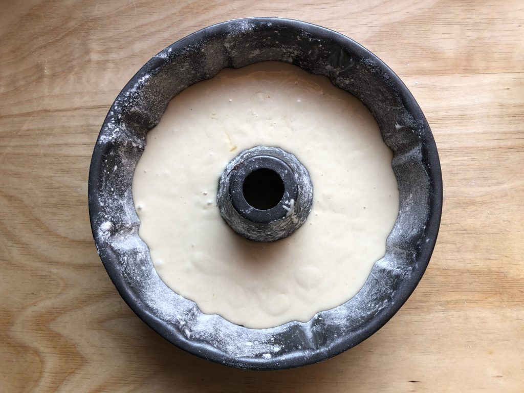 • Engrasar y enharinar un molde para bizcocho con un diámetro de 24 cm y verter en él la mitad de la masa.