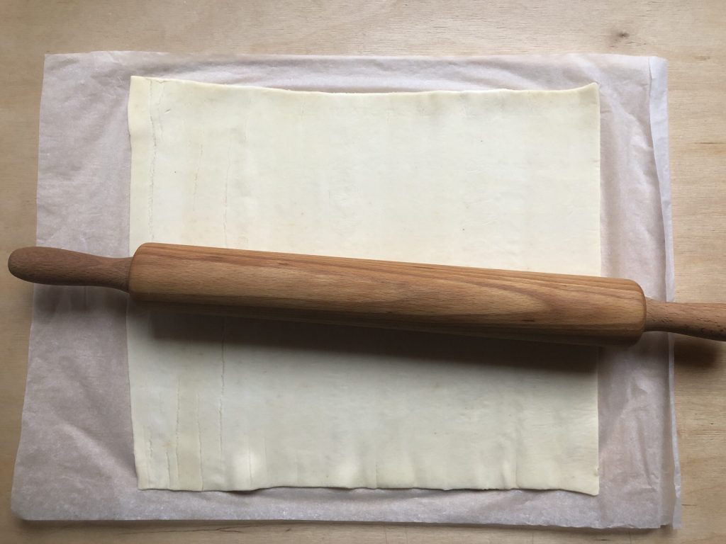 Desenrollar el hojaldre manteniéndolo sobre el papel de horno proporcionado en la confección y pasar el rodillo suavemente por encima.