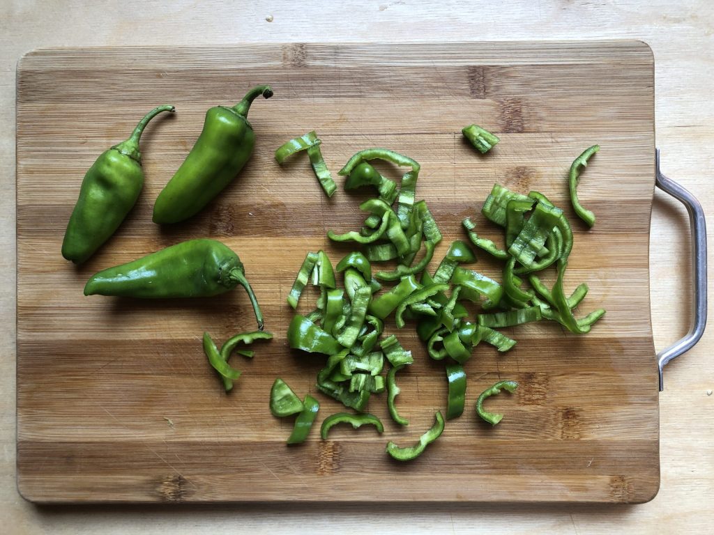 Limpiar los pimientos de Padrón eliminando el tallo, cortarlos por la mitad, quitar todas las semillas y cortarlos en tiras.