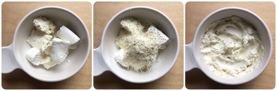 Poner en un cuenco pequeño la robiola, el queso de cabra para untar, el pecorino rallado y una buena cantidad de pimienta negra recién molida. Mezclar hasta obtener una crema homogénea.