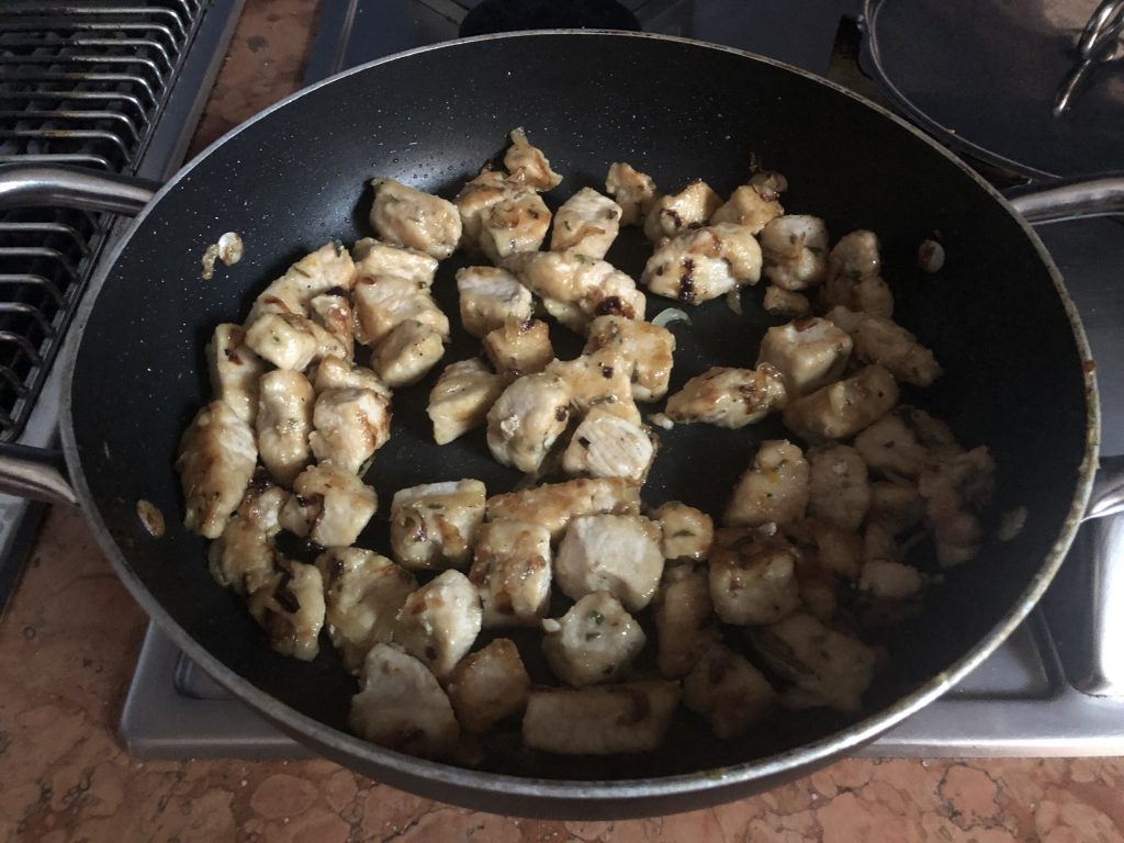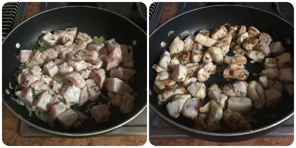 Luego añadir los bocados de pavo enharinados, aromatizar con el romero y dorar por todos los lados durante 6/7 minutos, removiendo a menudo.