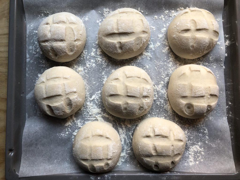 Ahora enharinar la superficie de los bollos y hacer en cada uno dos cortes en vertical y dos cortes en horizontal como se muestra en la foto.