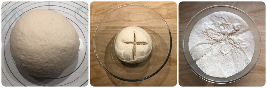 Luego modelar una bola, ponerla dentro de un bol grande, hacer un corte en cruz, cubrir con film y dejar reposar en un lugar cálido y protegido de corrientes de aire hasta que haya triplicado su volumen. Yo hice la masa por la noche y la dejé reposar toda la noche. Naturalmente, si has usado levadura de cerveza, los tiempos serán mucho más cortos.