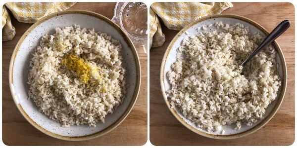 Cocer el arroz en abundante agua hirviendo con sal durante 10/12 minutos. Escurrirlo y transferirlo a un bol o a un plato hondo grande. Condimentarlo con 30 ml de aceite, la ralladura de medio limón y 30 ml de su jugo. Mezclar bien y dejar que se temple.