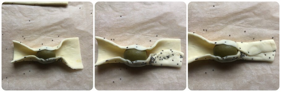 Envolver la aceituna en el hojaldre sin cerrarla completamente, luego «encerrarla» doblando el exceso de masa como se muestra en las fotos. En realidad, debéis doblar hacia el centro un lado del hojaldre excedente, luego doblar encima la parte superior de la masa.