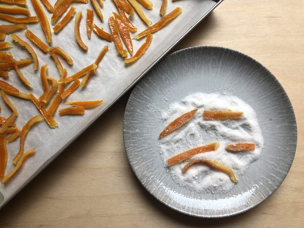 • Dejarlas así por algunas horas, luego pasarlas por azúcar granulada y colocarlas en una fuente. Las cáscaras de naranja confitadas están listas para ser disfrutadas o utilizadas en otras preparaciones. Yo las guardo en una caja de lata. ¡Disfrutad! Paola