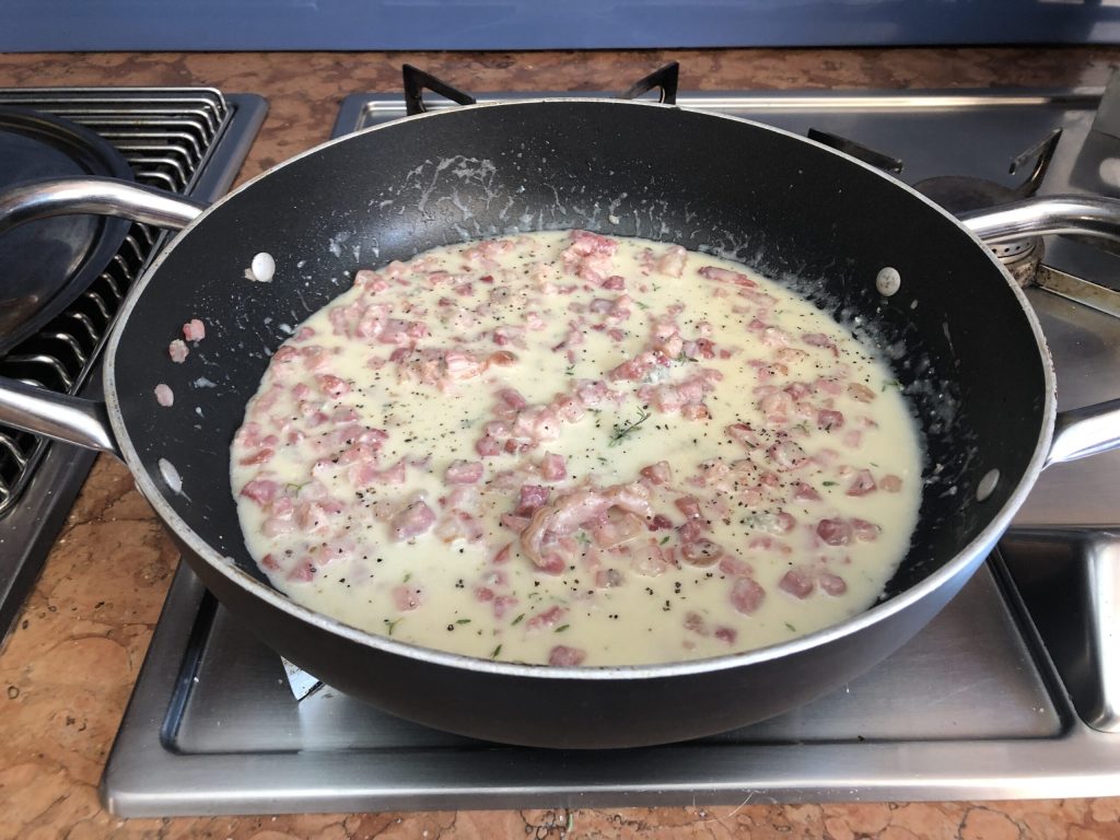 Dejar que el queso se derrita a fuego lento, luego perfumar con una molienda de pimienta negra y con hojas de tomillo.