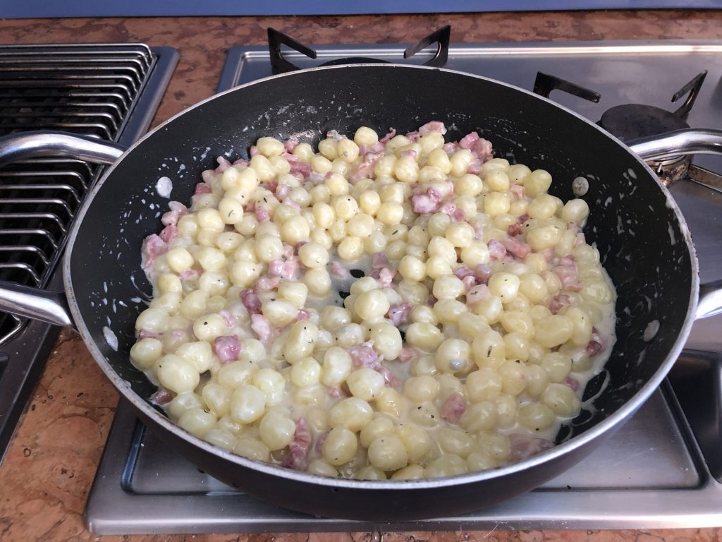 A menudo puede ser muuuuuy conveniente tener en el frigorífico un buen paquete de pasta fresca lista. No siempre se tiene el tiempo (o las ganas) de preparar también esa, ¿verdad? Sin embargo, no nos limitemos a condimentarla con mantequilla derretida y salvia. ¡Vamos! Estoy a punto de sugeriros una recetita simple simple, rápida rápida que os será de ayuda. Son unas chicche al gorgonzola y panceta realmente súper deliciosas. ¿Qué son las chicche? Son ñoquis de patata de pequeño tamaño que se cocinan en un periquete. En esta receta, el condimento es muy sabroso y seguramente os gustará. ¿Apostamos? En fin… velocidad, sabor, simplicidad. ¿Qué más se puede pedir?